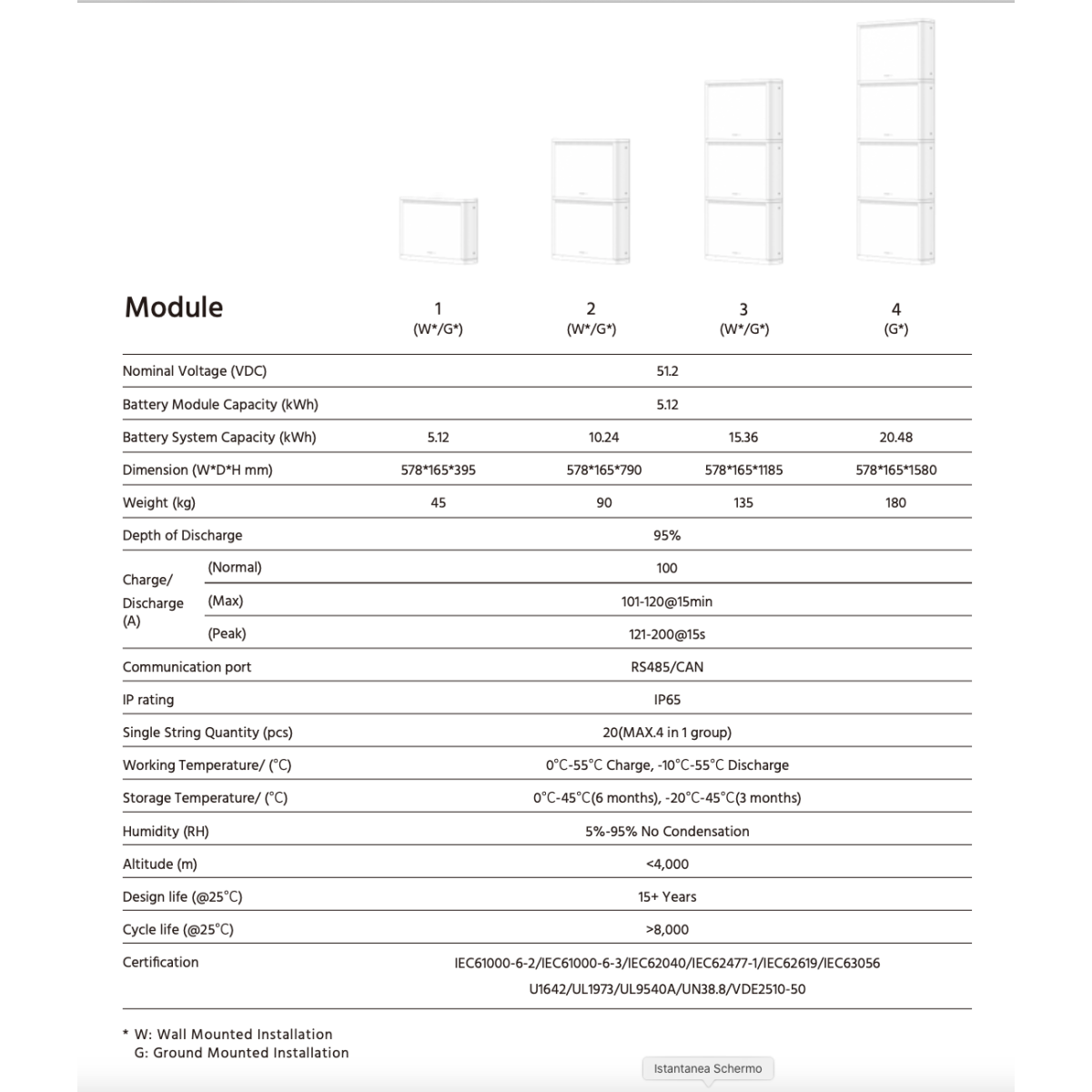 Parallel Capability: Allows parallel connection of up to 5 stacks (3-module stacks for wall mounting and 4-module stacks for ground mounting) for a scalable and powerful energy storage system.